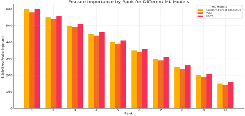 A bar chart is further created to demonstrate the comparison of the top ten attributes with their feature ranking. This bar chart in Figure 4 visualizes and compares the relative importance of features across three machine learning (ML) models: Random Forest Classifier, Support Vector Machine (SVM), and CART. The x-axis represents the Rank (1 to 10) of feature importance, while the y-axis indicates the Relative Importance (expressed as bubble sizes for clarity and significance). It allows for a direct comparison of how each model prioritizes different features in predicting outcomes.