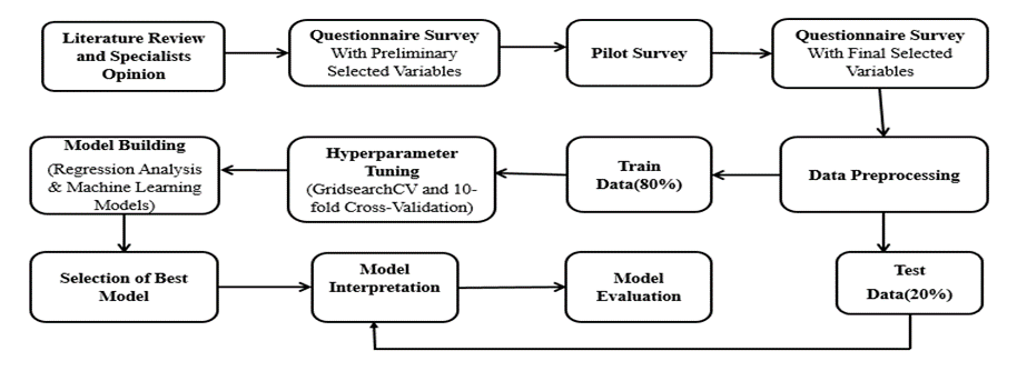 A diagram of methodological workflow of this study is depicted in Figure 1. The study corridor for this research focuses on the operational MRT Line 6 in Dhaka. Initially, preliminary variables for the questionnaire survey are selected based on an extensive literature review and expert opinions. This is followed by a pilot survey to refine these variables for the final data collection. Once the questionnaire form is finalized, data is collected from nine operational metro stations. Data preprocessing is then conducted to prepare the data for analysis including descriptive statistics performed based on respondents' perceptions. In the modeling phase, the most influential variables are selected. This was followed by grid search cross-validation with train and test data ratio of 80:20 for hyper-parameter tuning to enhance model performance. Regression models and machine learning models, i.e., RF, SVM and CART, are used for data analysis, with the models run using the selected variables. The best model, based on accuracy, is then identified and thoroughly interpreted. Simultaneously, the model is evaluated to determine if the selected variables adequately explain it.
