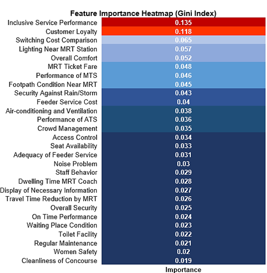 Figure 3 illustrates the feature importance of various factors influencing service quality (SQ), as determined by the Gini Index derived from the Random Forest model. Among the evaluated attributes, 'Inclusive Service Performance' emerged as the most significant predictor, highlighting its critical role in shaping overall perceptions of MRT service quality. For instance, including facilities for all the passengers on the MRT can lead to increased ridership [35]. This is followed by 'Customer Loyalty' and 'Switching Cost Comparison,' which also demonstrate strong importance in the model, underscoring their influence on passenger satisfaction.