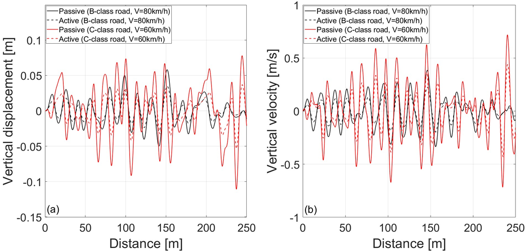 - Active suspension system provides lower values of vertical displacement and lower values of vertical velocity. The peak maximum/minimum displacement values approximately amount to ±0.05 m, whereas for velocity amount to ±0.5 m/s.