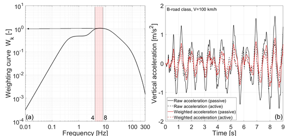 As an example, Fig. 4b shows the raw and weighted vertical acceleration for passive and active seat suspension for a B-road class and a bus speed of 100 km/h. It could be noticed that the weighted acceleration is of lower value than the raw acceleration.