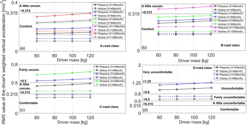 Fig. 14 RMS value of the weighted vertical acceleration for passive and active seat suspension systems for a) A-road class, b) B-road class, c) C-road class, d) D-road class, as a function of bus driver’s mass