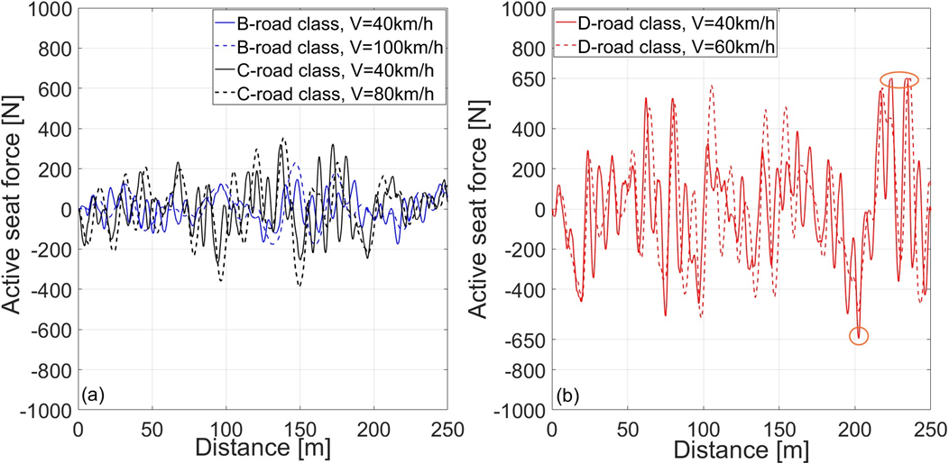 Fig. 12 presents an example of an active seat force that actuator should provide as a function of distance. Active seat force value increases with bus speed and with poorer road quality. For poor road quality, active force reached maximum values of ±650 N at bus velocity of 40 km/h and 60 km/h (Fig. 12b). Commercial electromechanical linear actuators capable of generating forces up to ±650 N and more are widely available. For example, standard 24 V DC linear actuators with nominal forces of 750 N to 1000 N are used for active seating applications (e.g. VEVOR 1000 N and 750 N actuators). Therefore, proposed actuator force range for the controller model defined in this work is feasible with real hardware. For the proposed actuator force limit of ±650 N and a maximum seat velocity of 0.5 m/s the peak mechanical power requirement would be around 325 W.