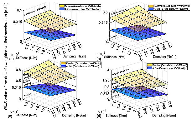 Long-term cyclic loading causes wear on the seat suspension system which is reflected in a gradual decrease in stiffness and damping. Fig. 13 shows the RMS value of the weighted vertical acceleration for passive and active seat suspension systems as a function of spring stiffness and shock-absorber damping coefficients. The ride comfort of the bus driver decreases with seat wear i.e. with a decrease in stiffness and damping for passive seat suspension. For example, for a D-road class and a bus speed of 60 km/h, the driver feels very uncomfortable in the case of the severe seat wear (stiffness of 10000 N/m and damping of 500 Ns/m which is reductions of 50 % of their nominal values, Fig. 13d). It could be noticed that active seat suspension compensates for seat wear and provides significantly better driver’s ride comfort for each road quality and for each bus speed.