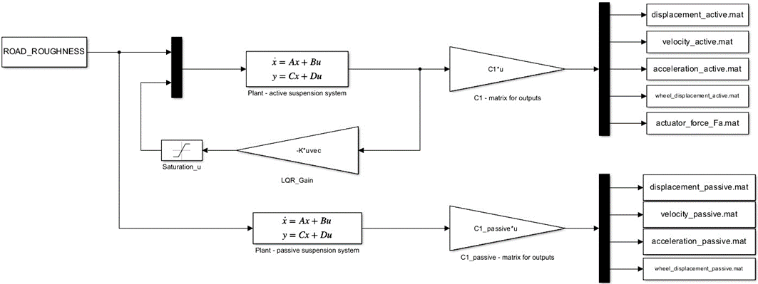 Fig. 2 shows bus driver’s seat model with active and passive (no active force Fa in equations (1-2)) suspension systems in MATLAB/Simulink software considering vertical dynamic and LQR equations in this Chapter. Saturation block (in the active seat suspension model) limits the values of the input signal to ±1, therefore holding active force Fa values within realistic ones.