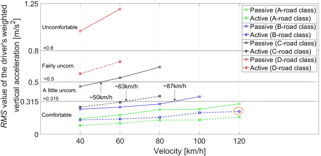 Fig. 8 presents the RMS values of the weighted vertical acceleration for passive and active seat suspension system as a function of considered bus speeds. The RMS values of vertical acceleration increase with the bus velocity for both suspension systems. Active seat suspension provides lower RMS values, therefore better bus driver’s ride comfort. For example, for the B-road class, the driver feels a little uncomfortable at a bus velocity of 87 km/h with the passive seat suspension system. For the B-road class, vertical vibrations have no effect on the driver’s ride comfort in the case of the active seat system. Moreover, with the seat active suspension, the driver feels comfortable even at a bus speed of 120 km/h. For the C-road class, the driver gets fairly uncomfortable for the passive seat system at a bus speed of 50 km/h, while he feels a little uncomfortable for the active seat system at a speed of 63 km/h. For the D-road class and for both bus speeds (40 km/h and 60 km/h), the driver feels uncomfortable with the passive seat system, and fairly uncomfortable with the active seat system.