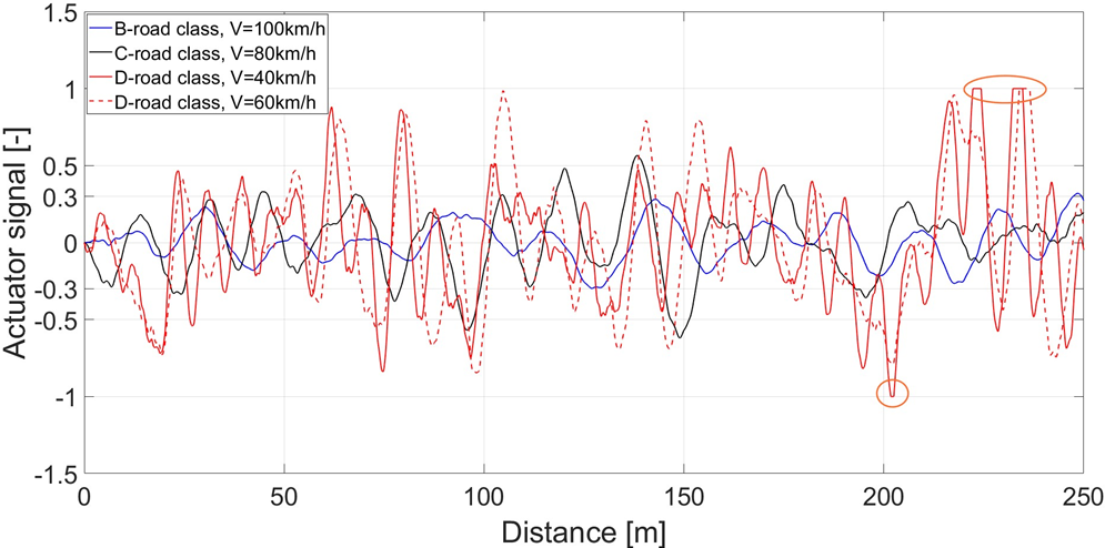 Fig. 11 presents an example of normalized actuator signal value as function of distance. Actuator signal value increases with bus velocity and with poorer road quality. For example, for B-road class and bus velocity of 100 km/h signal values are in the range ±0.3. For C-road class and bus velocity of 80 km/h signal values are in the range ±0.5. For D-road class and bus velocity of 40 km/h and 60 km/h control signal reached saturation values of ±1.
