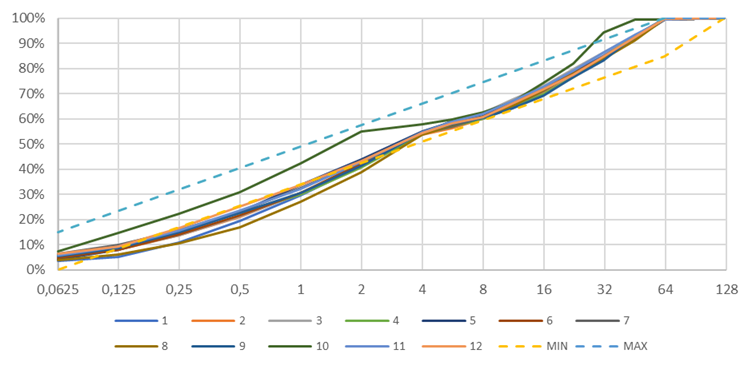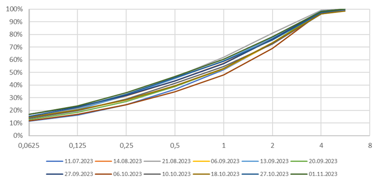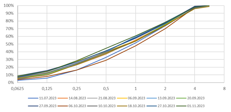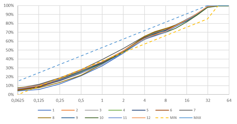 By mixing 0/4 A with 0/63 mixture, see figure 12, an increase of 0-4 mm particles is achieved which in the whole grain size range, as in the previous case, improves the product of the 0/63 fraction, which is deficient in these particles in the long term. By mixing these two fractions, the limit of a maximum fines content of 15 %, which is crucial for customers, is met.