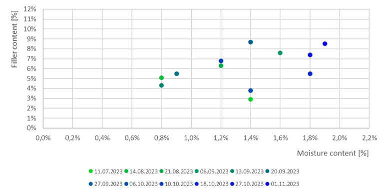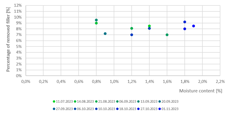 The efficiency of the ANIVI classifier is determined by the percentage of fine particles separated. In figure 9 can be observed that the separation efficiency is at a very good level ranging from 7 to 9,5 %. This efficiency was achieved independently of the moisture content of the input material.