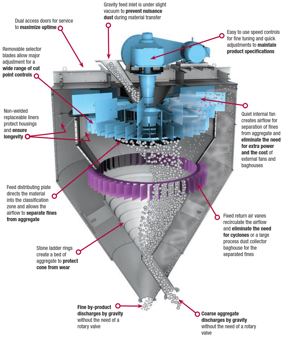 - Using the Anivi-Sturtevant dynamic classifier can reduce the content of fine particles in the produced aggregate.