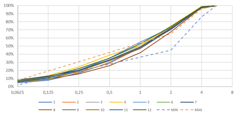 Mixing 0/4 A with 0/4 certified (0/4 c) provides satisfactory results, see figure 10. By mixing these two components, the condition for a fine particle content of 10 % is met which is crucial for the customers of 0/4 certified. Oversized particles matter in excess of 1-4 mm is then considered a tolerable deficiency.