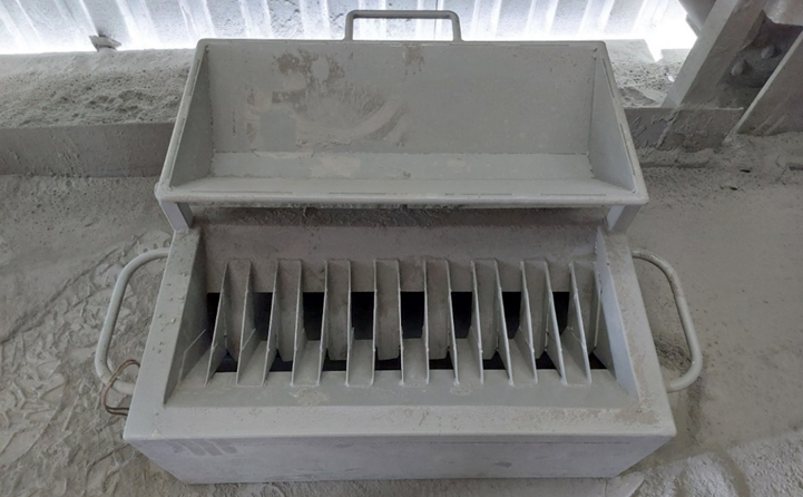 Sampling was carried out by controlled sampling of the material from the conveyor belt using a special shovel. The shovel was inserted into the falling flow of material for a few seconds while the conveyor belt was running, thus filling the shovel from the full width of the belt, see figure 4. This procedure was subsequently repeated again. A total of two shovels were mixed together and then quartered into a quartering box. There are two containers in the quarter, one of which was emptied into a PVC bag (sample) and the other was emptied onto a conveyor belt (waste). This procedure was repeated until the PVC bag contained a sample of at least approximately 15 kg. The sample in the PVC bag was closed, labeled and transported to the laboratory as soon as possible. The sample was subjected to a granulometric test and a moisture test.