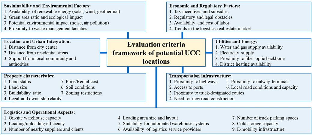 Despite the existence of valuable groundwork in these two streams of research, a clear methodological gap remains. Previous studies have not established a comprehensive, multi-level evaluation framework that integrates environmental, economic, regulatory, infrastructural, property-related, transportation, and operational criteria into a unified model tailored specifically to UCC site selection. Existing works often consider a narrower set of factors or treat UCC location decisions as secondary elements within broader logistics analyses. As a result, there is a lack of structured decision-support tools that can capture the full complexity of UCC planning.
