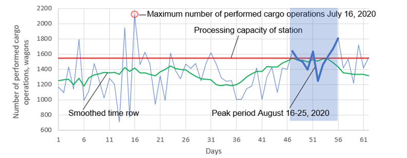 The study adopted the threshold of the probability of exceeding the daily processing capacity of 0.05. The analysis of the empirical function of the distribution of the random variable of the implemented processing capacity of the station shows that such a threshold corresponds to the processing capacity of 1545 wagons per day. Close to this value is achieved at k=10 days, with the processing capacity of the Nst, max is estimated at 1546 cars per day. This level of processing capacity of the station was achieved between July 16 and 25, 2020 (the period from 47 to 56 days in Fig. 3).