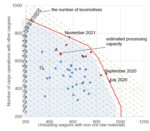 For the considered station, the value of its processing capacity for the estimated using the traditional methodology based on ratio of the volume of work of terminals is marked by А and is within the area Wp (see Fig. 6). The distance from point A to restriction 2 characterizes the presence of an overload of the station in separate periods of time, reaching 9%. Markers in Fig. 6 indicate the average daily volume of work per month 2019-2021. The accumulation of 10 of 36 observed volumes of work near restrictions 1-3 indicates the need to develop reconstructive measures to increase the processing capacity of the station.