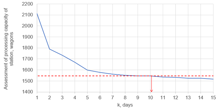 At the same time, in some days the volumes of general arrival and departure of loaded wagons may be recorded in excess of processing capacity, but such events should rarely occur. The number of values of the original function for calculating the sliding average k on one side should be sufficient to exclude short-term fluctuations in the volume of arrival and departure of wagons, and on the other – as little as possible as the periods of work of the station in the conditions of maximum load are short-lived. The dependence between the value of k and the assessment of the processing capacity of the station is shown in Fig. 4.