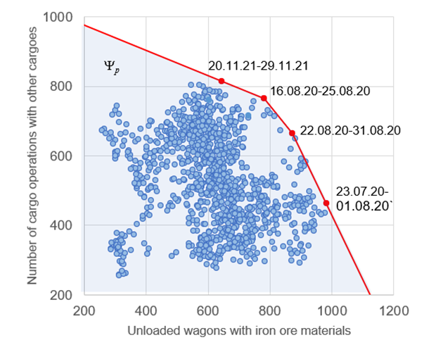 In the set of points obtained according to the observations of points, there are a set of alternatives that cannot be improved – the Pareto set. On the basis of these points, the boundary of the region of Yp is formed, which characterizes the implemented station processing capacity. This limit is shown in Fig. 5, red line.