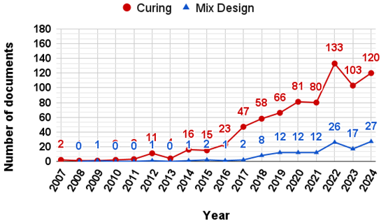Huge infrastructure demands have driven India and China to conduct the maximum GPC research globally in the design of mixes and in curing practices (Figure 2). The majority of the research originates from Asia and Europe, leaving Africa and smaller countries far behind. Publication trends (Figure 3) in Scopus (2007-2024) reveal India's growing GPC research with 888 papers, reflecting the increased focus on sustainable construction. Data shows that curing research (133 research papers published in 2022 and 120 research papers in 2024) developed at 22.3% annually since 2016, focusing on heat/ambient/steam curing. The mix design studies have grown more rapidly (39% per year), up to 26-27 papers in 2022-2024, as compared with 1-2 papers in 2016, to accommodate the demands of sustainable formulations. These trends show the increasing efforts of India to come up with viable curing options and green mixes in order to render construction sustainability.