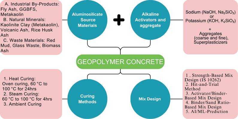 Fig. 1. Composition, Curing techniques and Different Mix Design Approaches, schematic for GPC