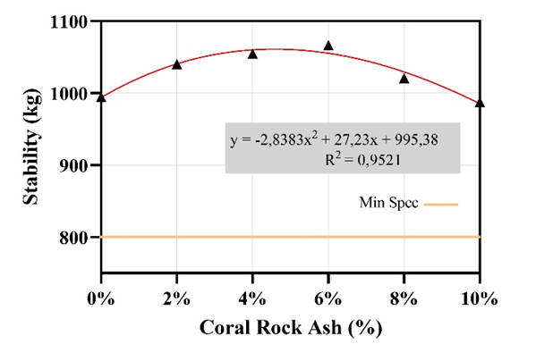 where y – the stability value of the mixture and x – the variation of coral ash content. To determine the peak value of the polynomial line using equation (2), a stability value of 1060.694 kg was obtained with an optimum coral rock ash content of 4.8%. This optimum variation will be used as a reference for subsequent tests.