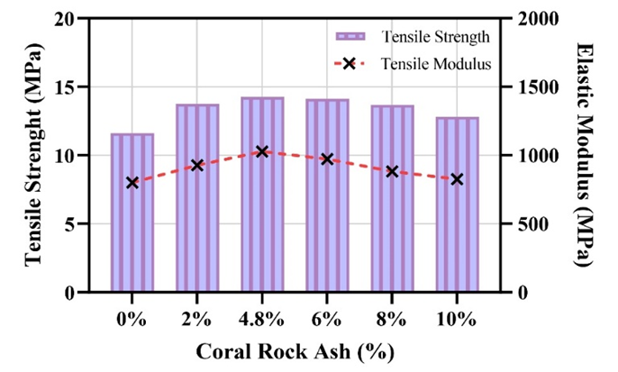In Fig. 5, it is evident that incorporating coral rock ash as an additive material increases the tensile strength value. This enhancement can be attributed to the presence of the chemical compound CaCO3 in coral rock ash. Through this test, the optimal coral ash content was determined to be 4.8%, resulting in a tensile strength value of 14.25 MPa. A higher tensile strength in the mixture enables it to withstand greater tensile strain, thereby reinforcing its resistance to crack formation, particularly wide cracks that could compromise the road structure. However, this reinforcement is only effective at the optimal level; excessive addition of coral rock ash can lead to increased cracking and reduced durability under repeated loads. Similarly, research on Reclaimed Asphalt Pavement mixtures aimed at enhancing pavement performance has revealed that excessive levels of additives can diminish the tensile strength of the mixture [42]. This behavior is also observed when an excessive use of additives leads to reduced performance in terms of tensile strength [43].