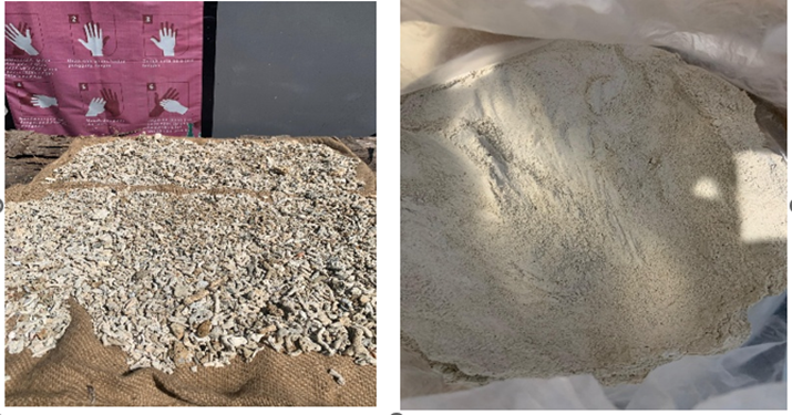 The supplementary material investigated in this study was coral rock ash (CRA), produced from naturally stranded, non-living coral rock debris that has been transported to the coast by ocean currents. The collected material was oven-dried and then pulverized by grinding to obtain a fine ash, as shown in Fig. 2. In this manuscript, the term “stone ash” refers to mineral filler/fines (passing the 0.075 mm sieve) commonly used in Indonesian asphalt mixtures as a filler component, rather than combustion ash. The physical properties of the aggregates and filler are also reported in Table 1.