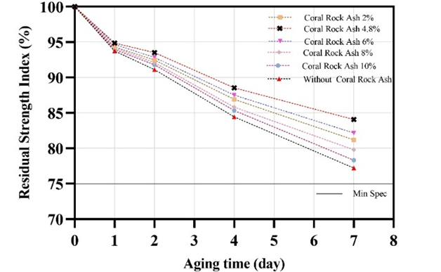 Notably, the utilization of coral rock ash mitigates this decline, albeit to a lesser extent compared to mixtures without coral rock ash. This can be attributed to the calcium carbonate content in coral rock ash, which enhances adhesion between mixtures and maintains results meeting the predetermined requirement of ≥ 75% [34].