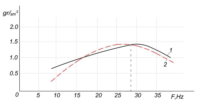 Fig. 7. Soil density versus vibratory roller drum frequency: 1 - experimental curve; 2 - theoretical curve calculated using regression formulas