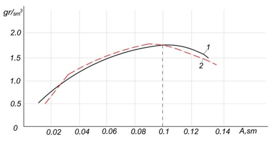 Fig. 6. Soil density versus vibratory roller drum amplitude: 1 - experimental curve; 2 - theoretical curve calculated using regression formulas