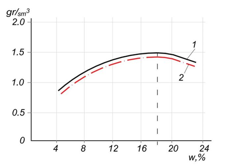 Fig. 4. Soil density versus moisture content: 1 - experimental curve; 2 - theoretical curve calculated using regression formulas