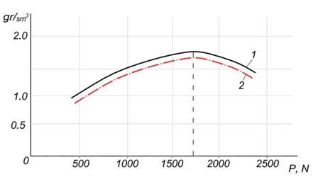 Fig. 5. Soil density versus compaction force: 1 - experimental curve; 2 - theoretical curve calculated using regression formulas