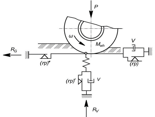 The horizontal reactive component of the wheel ($R_G$) is simulated by the viscoplastic model ($rp$) ($v$), which represents the Bingham model without an elastic element. The vertical reaction to the wheel ($R_V$) is simulated by the elastic-viscoplastic Bingham model. The equations describing the Bingham elastoviscoplastic model are as follows: