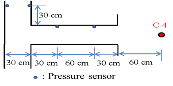 Five types of C4 explosive quantities (100, 150, 200, 250, and 350 g) were used in the near-ground explosion experiment. The explosives were hung at 30 cm above the ground. The pencil probe was configured in two ways to record the pressure time history. Firstly, it was set at 60 and 150 cm from the source of the explosion. The second time it was set at 90 and 230 cm from the source of the explosion. The distance values were based on the weight of the explosive and the measuring distance where the pen gauge was placed. The scale ranged from 0.85 to 4.95 m/kg1/3.