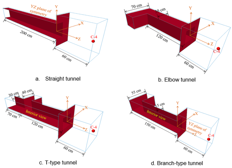 Recent studies have demonstrated that tunnel geometry, cross-sectional variation, and branching configurations significantly influence blast wave attenuation and pressure redistribution mechanisms [22-24, 26-29, 30]. Numerical investigations using finite element and coupled Eulerian–Lagrangian approaches further indicate that complex tunnel layouts may induce asymmetric pressure amplification at bending and branching sections [21, 23, 27, 28, 30]. However, most existing studies primarily focus on straight or circular tunnels, while the combined effects of tunnel geometry variations and near-field external explosions on pressure transmission mechanisms remain insufficiently investigated [22, 23, 26, 27]. Therefore, this study integrates small-scale explosion experiments and validated numerical simulations to systematically investigate blast wave transmission characteristics in straight, elbow, T-type, and branched tunnel configurations, providing quantitative insights for protective tunnel design [24, 25, 28–30].
