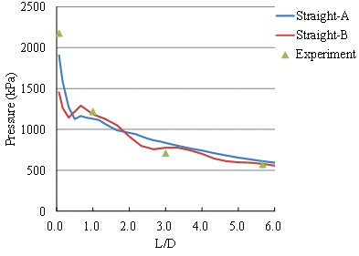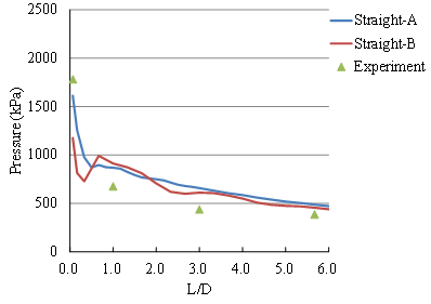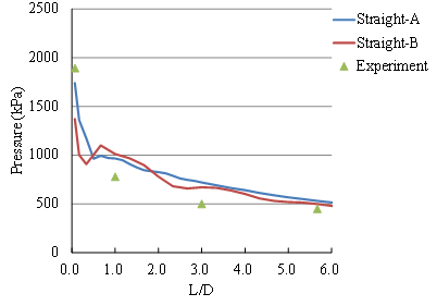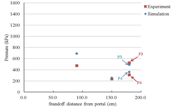 In comparing the straight branch section, the experimental P4 burst transmission position of the pressure was 0.63 -fold (detonation pressure decay 37%), while TM5-855-1 provided empirical formula branched straight segment was transmitted burst pressure 0.80 times in the UFC 3. In terms of the empirical formula of 340-01, the two blast pressure values at position P1 were substituted into the empirical formula. The blast pressure values of the straight section were214.70 and 357.33 kPa, respectively. The blast pressure transmission rate was 0.74 times (blast pressure attenuation 26%). P4 burst pressure transfer rate and a position of the UFC 3-340-01 empirical formula were similar.
