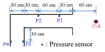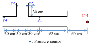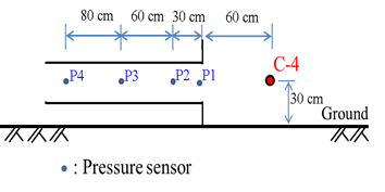 The cross-section size of the test specimen was the same as that of a straight tunnel. The elbow tunnel was composed of a straight section and a turning section. The straight section was 150 cm long, and the turning section was 40 cm long. The burst pressure gauges were installed on the side wall of the test body and were at 30 cm and 90 cm positions from the mouth and at 30 cm after the turning section on both sides. The experiment used two kinds of C4 explosives (10 and 250 grams) to understand the change of blast pressure transmission in the tunnel under different explosive quantity conditions. The explosive was placed 30 cm above ground 30cm and 60cm from the tunnel’s entrance. The elbow tunnel was a rectangular section tunnel with a side length of 30 cm. Two types of C4 explosives (100 and 250 grams) were used for the external explosion experiment of the tunnel. The burst pressure gauge was set on the inner side of the tunnel wall. The distance between the installation position and the tunnel opening was 30cm, 90cm, and 30cm on both sides after the turning section. The position of each burst pressure gauge is represented by P1 to P4. To understand the shape effects of pressure wave propagation in the elbow tunnel, the pressure gauges were positioned at P2, P3, and P4. The blast pressure measured was compared to P1 and P2 positions in the straight tunnel.