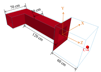 We assumed that the projectile weapon exploded at a distance of 12 m from the tunnel’s entrance. The amount of C4 explosives used was 800, 1200, 1600, 2000, and 2800 kg. The blast pressure generated was transmitted 40 m along the rectangular section of the tunnel (side length 6 m). The explosion experiment was carried out with a scale effect of 1/20. Therefore, the distance between the explosive source and the tunnel entrance is 60 cm. The amount of C4 explosive used was 100, 150, 200, 250, and 350 g. The rectangular tunnel had a total length of 200 cm, whereas the scale model had a side length of 30 cm. The impact of the blast pressure generated by the near-field explosion on the inside of the tunnel was analyzed. The experimental part was divided into three types and five experiments.
