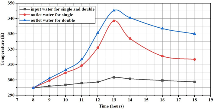 The experimental data will offer the most important results in terms of the thermal performance of the solar water heating system used in the reality of solar irradiation conditions. Data on the temperature change with time of the two systems (two-loop and single-loop) can be presented in Fig. 4. As seen in the figure, the ambient temperature was 20oC at 8.00 AM and their highest value of 35oC was at 1.00 PM and then they are increasingly decreasing up to 29oC at 6.00 PM. It is also possible to explain this somewhat advance attainment of high temperature by the cylindrical geometry of the collector because, by virtue of its design, it has the capability to absorb solar energy at all angles around the sun on a daily basis. An analytical comparison of the single and double coil configurations illustrates that there are huge variations in performance.