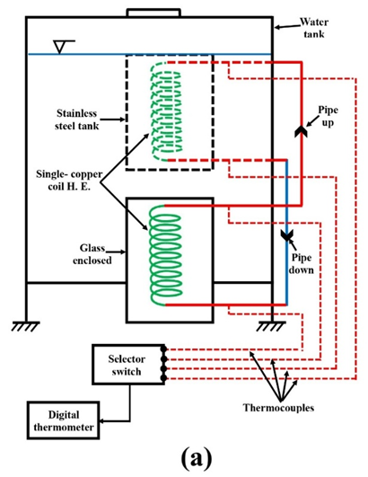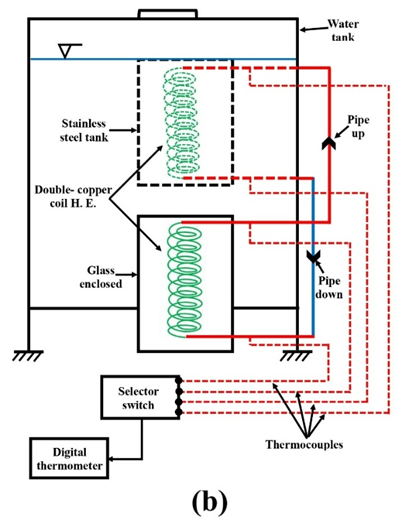 This experimental study investigates a natural circulation solar water heating system based on thermosiphon principles. The pump-free and electricity-independent design makes this system particularly advantageous for high solar irradiance regions. As shown in the Fig. 3 (a and b) the closed-loop configuration comprises two principal elements: the solar collector assembly and the storage tank. The solar collector assembly features an innovative helical coil configuration fabricated from a 6-meter-long copper tube with 12 mm outer diameter and 1 mm wall thickness. The coil forms six complete loops with 200 mm outer diameter and 50 mm pitch between turns. The assembly of this absorber takes the form of a protective glass housing 250 mm x 250 mm x500 mm with 10 mm thick glazing such that it reduces the amounts of convective heat loss whilst maximizing the amount of solar energy absorbed. The system is designed with a verticulently oriented storage tank making it 300 mm x 300 mm x 500 mm and which is strategically set at elevation of 1.5 meters above collector plane to have proper therapeutic siphonic head. A built-in central position within the tank is a double-coil heat exchanger which corresponds with the primary collector specifications in length (6 m) and diameter (12 mm copper tubing of the same helical geometry) to optimize the exchanger heat transfer. The functioning of systems is completely based on fluid dynamics with the density being natural. The incident solar radiation is used to heat up the working fluid (water or acetone) in the collector coil that lowers the density of the fluid which generates a buoyancy force that results in upward flow. At the same time, the storage tank releases the cooler or warmer fluid in a cloudy form to the ground level at the same time, creating the supply chain of cooler or warmer fluid. The secondary heat exchanger coil holds thermal energy that is transmitted to domestic water line without getting mixed with the heat transfer and potable water loops. The design has several benefits: full removal of mechanical pumps and electrical parts ensures that the system is operation free, the coil design is highly perfective in ensuring that the heat transfer area is increased through the use of a spiral type coil and the system requires no electricity other than the sun thus making the whole system applicable in off-grid mode. The trial processing was done using a strict 3-stage procedure. The first charging of the system was used when the select working fluid (water or acetone) was carefully added both into the collector and storage circuit. In the solar exposure test, the array was put under controlled irradiance conditions and parameters like temperature altered at strategic points which include the collector outlet stream, tank inlet and tank outlet ports. The overall performance test was used to evaluate several indicators: the rise of the temperature kinetics, the ability to retain heat, and the stability of the cycle under different conditions of solar flux variation.