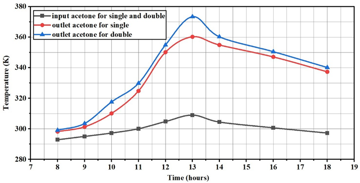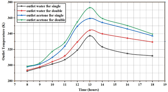 The variation between the inlet and outlet temperatures in both the single- and double-loop cases for the water and acetone versus time can be illustrated in Figs. 5 and 6, respectively. Whereas, Fig. 7 shows the relationship between the outlet temperature of water and acetone, and for both single and double loops, versus time. The temperature profile analysis of the vertical collector, presented in Figs. 5 and 6, reveals that the system reaches its maximum operating temperature at 1:00 PM, achieving 72°C when using water as the working fluid and 100°C with acetone vapor. Fig. 5 clearly shows that the double-loop design improves water inlet temperatures by 32.4% compared to the single-loop arrangement, while maintaining a consistent linear temperature increase pattern during daylight operation. With respect of acetone, the Fig. 6 show the increase percentage of the acetone inlet temperature by 12.5%. The outlet temperature measurements, illustrated in Fig. 7, further confirm the advantages of the double-coil system of the acetone, which achieves a 7.67% at 1:00 PM higher than that of the double-loop for water. The increased heat transfer surface area of the double coil set up which strengthens the absorption of solar energy and the natural thermosiphon circulatory effect brings about this improvement.