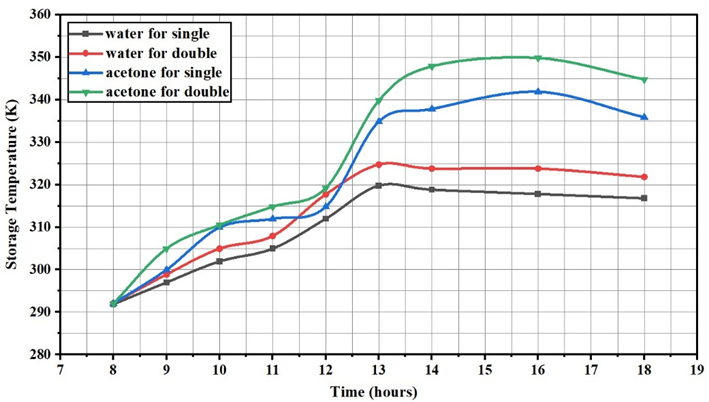 Fig. 8 indicates the dependence of storage temperature of water and acetone of the single and the two loops with time. Its profile of efficiency illustrated in Fig. 8 is two-stage in nature. At the first stage, the efficiency is gradually peaking and directly proportional to increasing solar irradiance reaching the highest value at the 1:00 PM. The second one is characterized by a sharp rise of efficiency towards the end of the afternoon, where the maximum storage temperature is 4:00 PM. This sluggish peak performance is contributed by two important reasons: by the good preservation of the residual heat in the storage tank and by the increased convective heats conduction measures that are in the system. Such a considerable improvement of performance was mainly obtained through the use of two novel design characteristics, the helical coil arrangement that has caused the best utilization of the solar exposure and the heat transfer efficiency, and the use of the two-loop configuration that has decreased the fluid residence time but increased the thermal exchange capacity. These detailed experimental findings are conclusive in their ability to confirm that the system has high performance based on the traditional solar thermal technologies. It is especially useful in the applications where space is a sensitive issue, maintenance is a key factor, and energy efficiency is a concern, and the design is an impressive solution to the new-age sustainable heating.