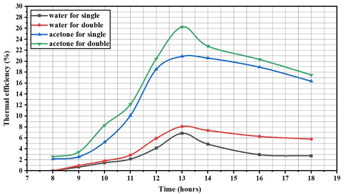 The variation between the thermal efficiency in both the single- and double-loop cases for the water and acetone versus time can be illustrated in Fig. 9. For all cases, it can be seen from the figure that the efficiency starts to increase from 8:00 AM until it reaches its maximum value at 1:00 PM, after which it starts to gradually decrease. It was also observed that acetone had higher efficiency in both the single- and double-loop cases compared to water, where it increased by 77.66 and 70.78% respectively. Compared to the single-loop case, the efficiency of the double-loop case was found to be increased by 13.76% and 34.07% for acetone and water, respectively.