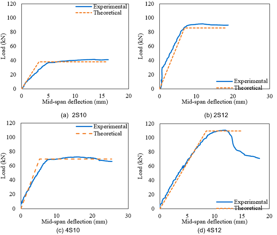 Figures (11 and 12) compare the theoretical and experimental load–mid-deflection curves for the two group tested specimens. The overall trend of the theoretical curves was in reasonable agreement with the experimental results, particularly in capturing the general shape of the load-deflection response. However, the ultimate load-carrying capacities were overestimated for specimens with a total reinforcement ratio exceeding 1.06%. This discrepancy can be attributed to the assumptions made in the theoretical modeling, where steel or BFRP bars were idealized as fully bonded to the concrete matrix.