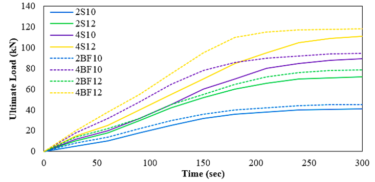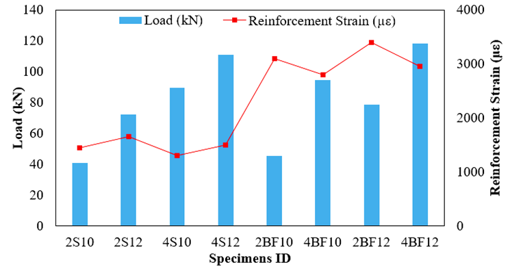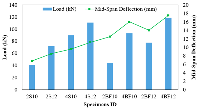 The experimental results, shown in Table (6), demonstrate a clear distinction between steel- and BFRP-reinforced beams, consistent with ACI 440.2R-08 predictions. Steel-reinforced beams (2S10-4S12) exhibited ductile flexural failure, with yielding of steel followed by gradual concrete crushing, allowing for large deflections, crack development and controlled energy dissipation; the highest steel-reinforced beam, 4S12, achieved 110.966 kN while maintaining ductility.