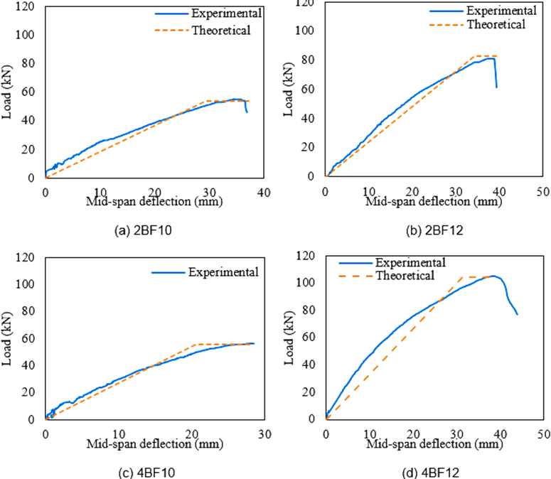 In contrast, BFRP-reinforced beams (2BF10-4BF12) showed brittle failure governed by concrete crushing, as the linear-elastic BFRP bars did not yield, leading to sudden failure after moderate to large deflections. Lower-reinforced BFRP beams exhibited moderate ductility, while higher-reinforced beams, such as 4BF12, reached 118.2 kN but failed abruptly, emphasizing the trade-off between high ultimate load and reduced post-peak deformation.These findings highlight that steel beams provide controlled, ductile behavior, whereas BFRP beams offer higher load capacity at the cost of ductility, confirming the reliability of ACI 440.2R-08 in predicting failure modes for both reinforcement types.