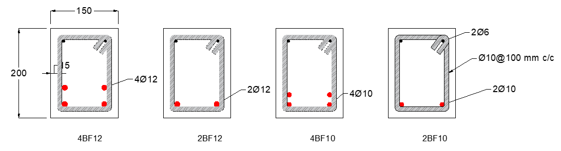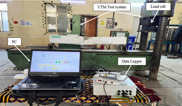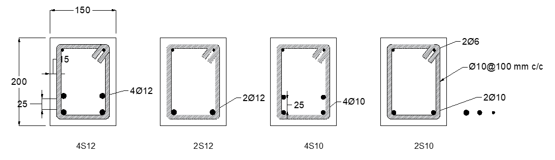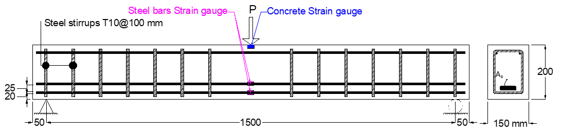 Each RC beam had an overall length of 1600 mm with a clear span of 1500 mm, measured from the center of one support bearing to the other, as illustrated in Figure (1 a and b). The cross-sectional dimensions were kept constant across all specimens, with a width of 150 mm and a total depth of 200 mm, forming a standard rectangular section (refer to Figure 2 a and b).