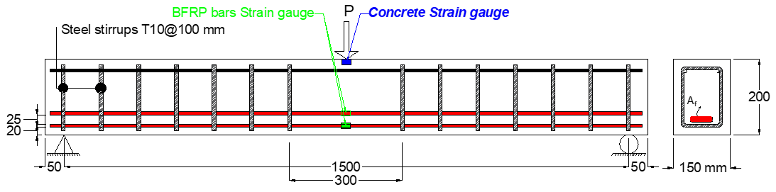 The experimental investigation involved testing eight, simply supported RC beams to evaluate their flexural behavior and the effectiveness of different reinforcement types. The specimens were divided into two main groups: four beams reinforced with conventional steel bars and four with BFRP bars. Details of the specimens are presented in Table 1.