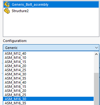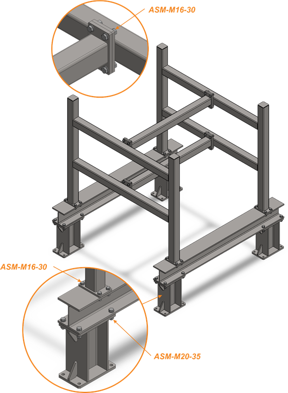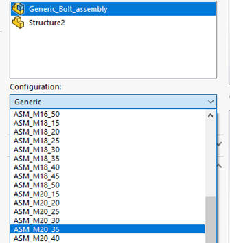 In this particular case, two different types of bolted joint are present – ASM-M16-30 and ASM-M20-35. They can be easily chosen and applied from the multiple configurations in Fig. 20. In this sample only two different types of bolted joints are present, but in other cases there can be ten, twenty or more different mounting lengths. With this parametric model the bolted joints can be easily applied, using also the Copy mate’s feature.