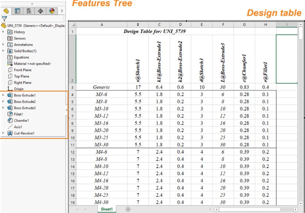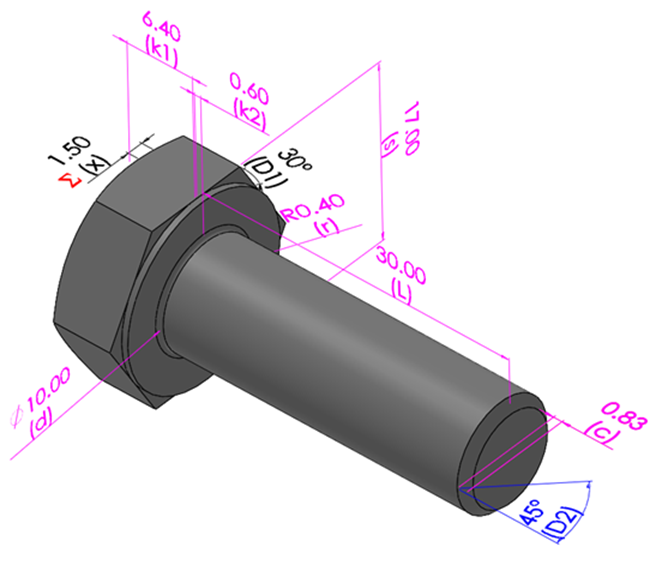 For the parametric bolt modeling the dimensions of the UNI_5739 standard are used as one of the most commonly used in mechanical constructions. (Fig. 3). First it was created a 3D rendered image with the thread visible. (Fig. 1). For the Generic model is is used screw M10x30 mm. All the Configurations are created in Design table, using Solidworks‘abilities to create multiple configurations with an easy way to change, update, and modify.