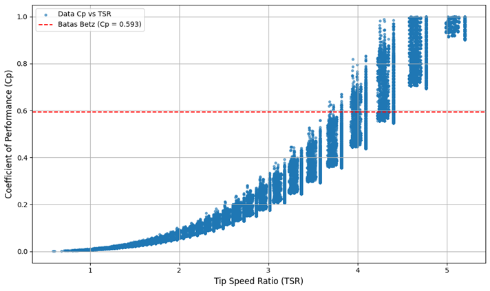 As shown in Eq. (5), a one-unit rise in the TSR leads to an increase of 0.302 in the Cp. This implies that a higher TSR to wind velocity corresponds to a proportionally improved turbine efficiency in converting wind kinetic energy into electrical power (Cp).
